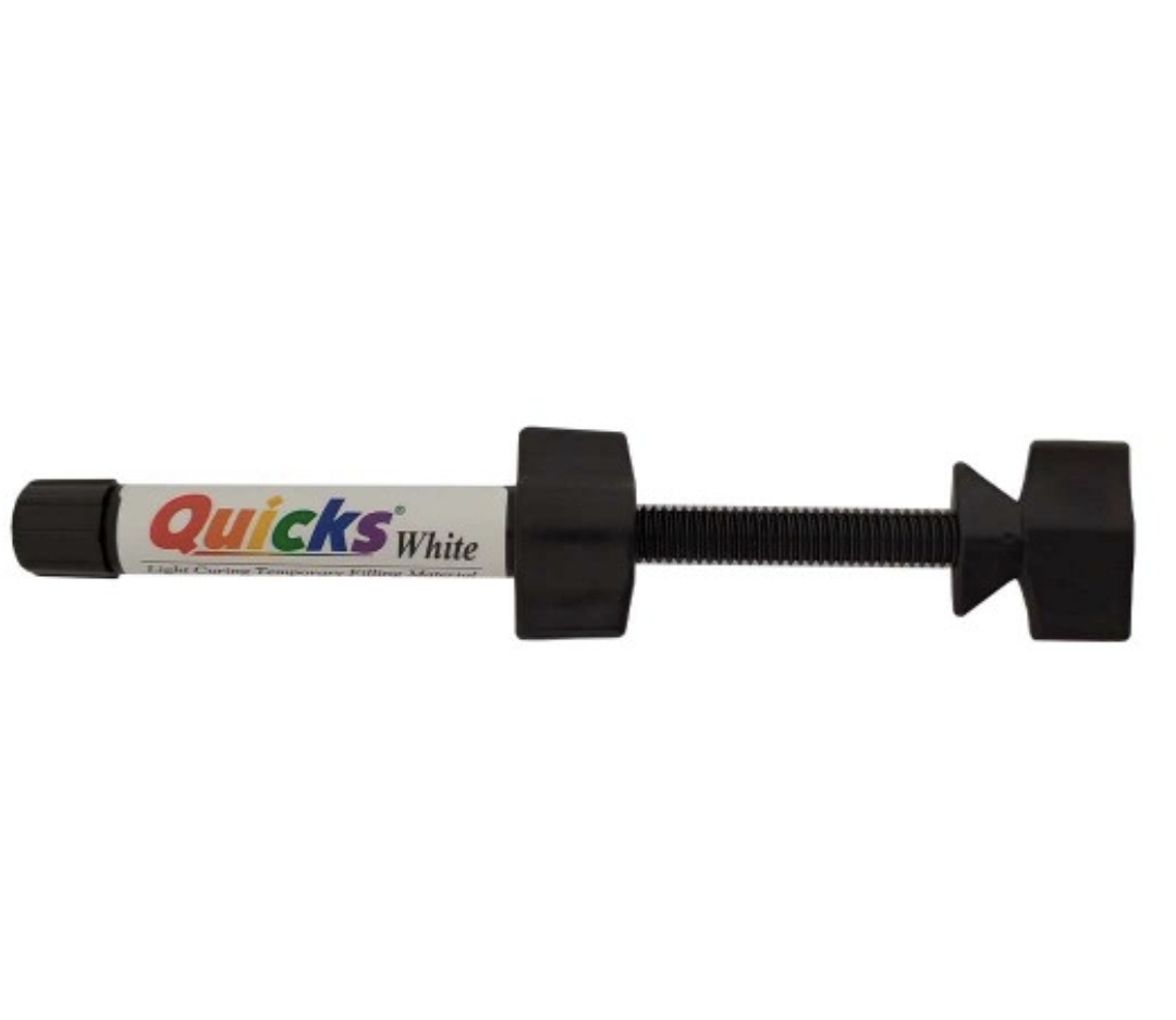 ویژگیهای پانسمان موقت نوری – Quicks: - مناسب ترمیم موقت حفرات تراش داده شده از یک تا هفت روز - سودمند در موارد اینله / آنله - سهولت تخلیه و عدم چسبندگی - برداشت راحت به صورت یک تکه - ممانعت از ریز نشت در لبههای حفره - خاصیت ارتجاعی و استحکام فشاری بالا - محتویات بسته: 3 عدد سرنگ 3 گرمی