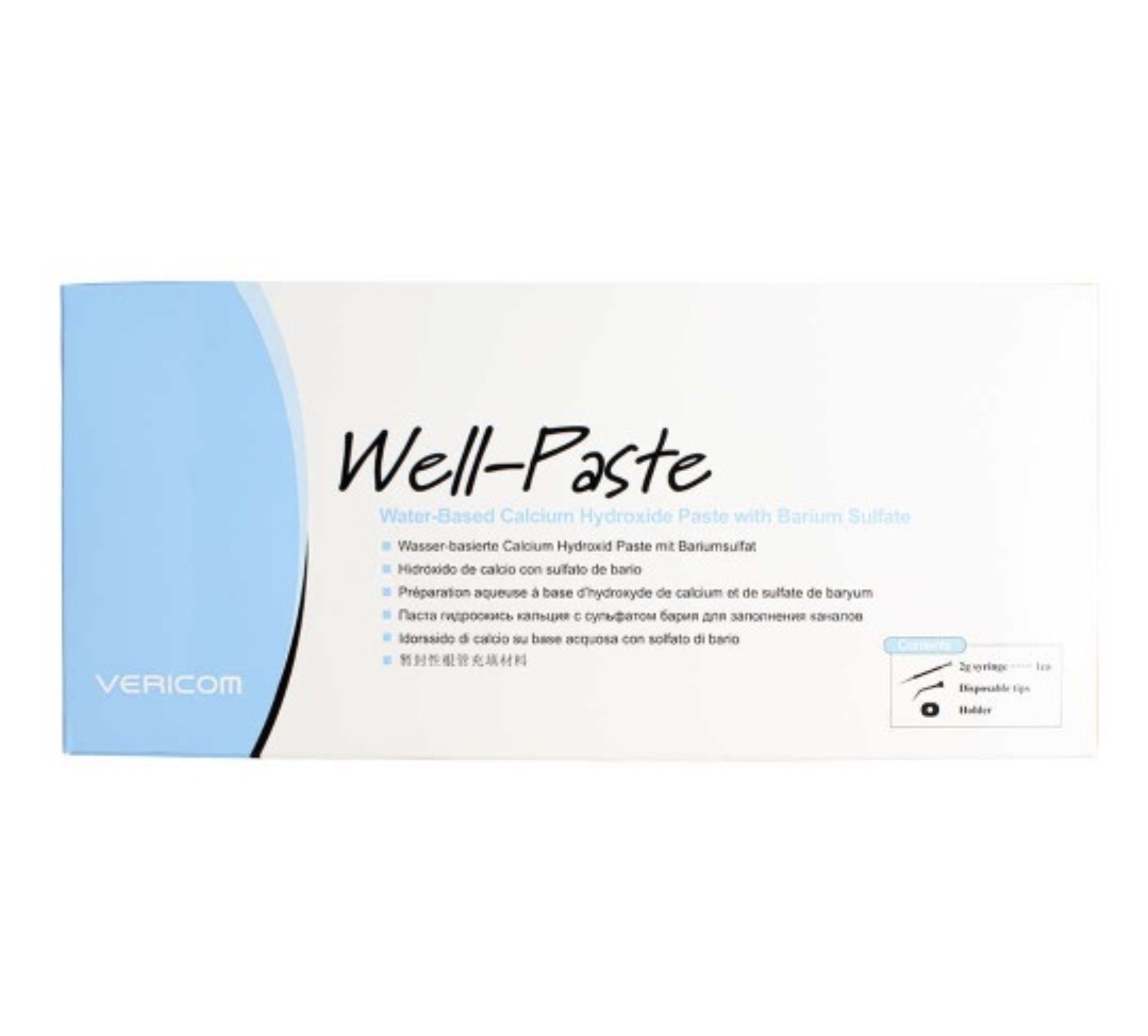 ویژگی های کلسیم هیدروکساید سرنگی - Calcium Hydroxide Paste Well-Paste: - ماده پر کننده برای کانال های ریشه عفونی - حاوی کلسیم هیدروکساید و باریم سولفات - دارای ویژگی های ضد باکتریایی - بر پایه آب - محتویات بسته: یک عدد سرنگ 2 گرمی + 20 عدد سری یکبار مصرف + 1 عدد هلدر