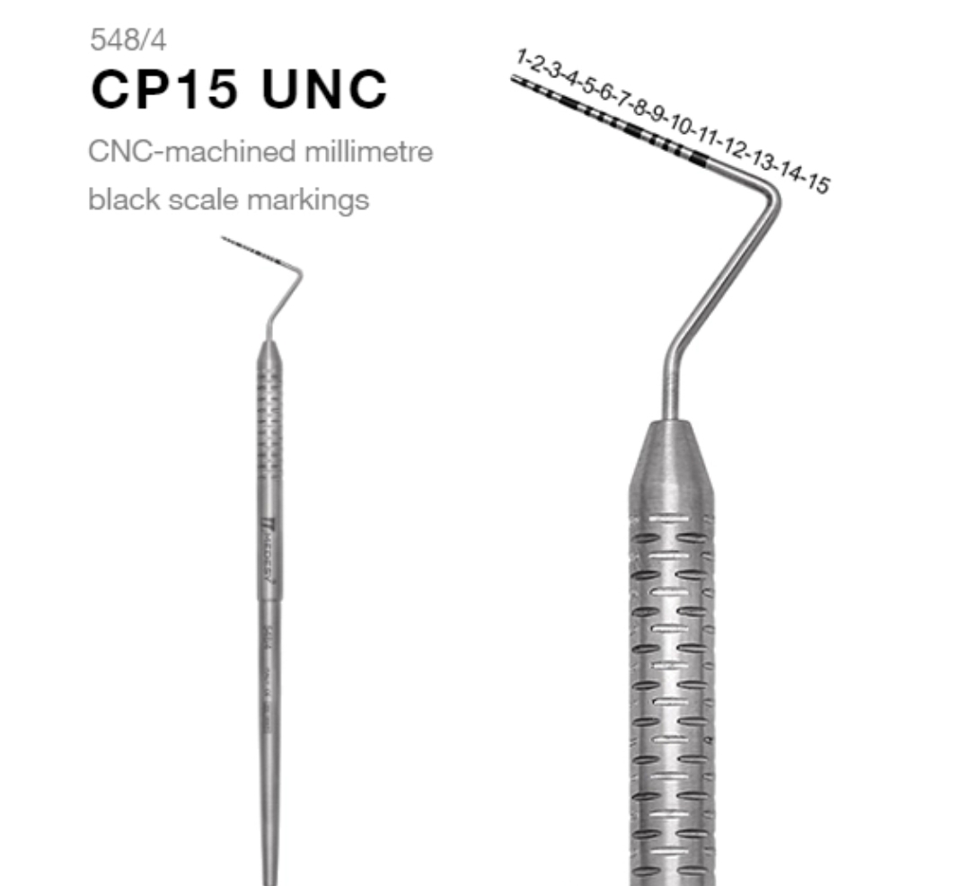 ویژگیهای پروب مدرج - Sonda Parodontale: - مقیاسهای میلیمتری علامت گذاری شده با برش لیزری CNC - مقیاسهای بدون شیار با مقاومت طولانی - مقاومت در برابر مواد ضدعفونی کننده - برای اندازه گیری عمق سالکوس وعمق پاکت - جنس روکش: کربن مقاوم (DLC) - جنس بدنه: استیل ضد زنگ - انواع: CP11 و CP15