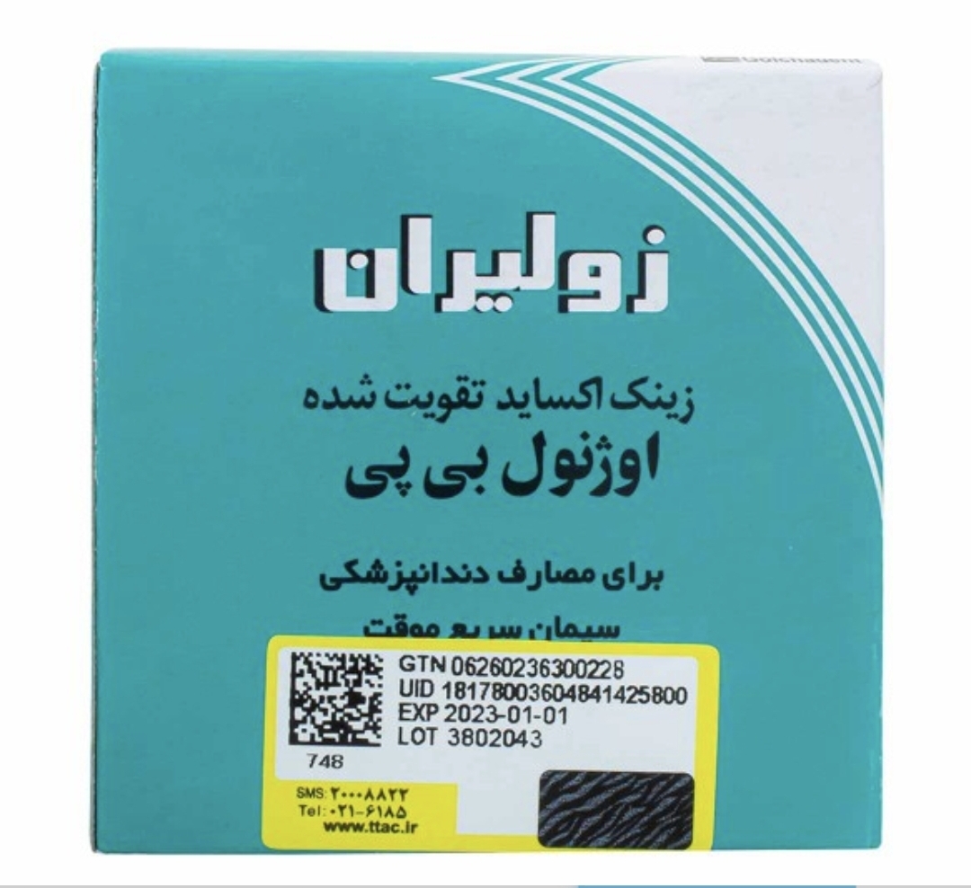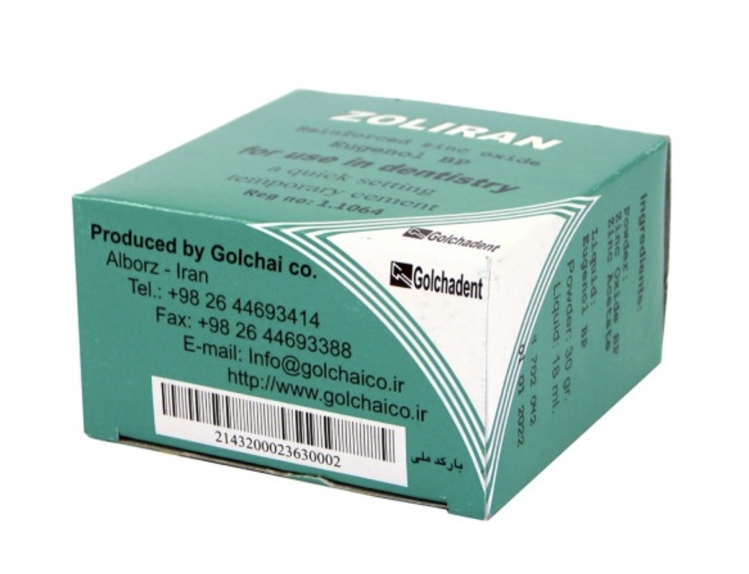 ویژگیهای زونالین زولیران- Zonalin: - یک سمان با پایه اوژنول و زینک اکساید - مناسب به عنوان سمان موقت Crown , Inlayها - زمان شروع سخت شدن ۳ تا ۴ دقیقه بعد از اختلاط - قابل استفاده در زیر مواد ترمیمی به دلیل روان شدن این ماده و نیز قدرت تحمل فشاری آن - محتویات بسته: ۳۰ گرم پودر + ۱۸ میلیلیتری اوژنول